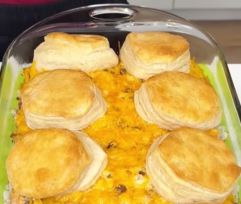 Top your casserole with the other half of biscuits and smother with melted butter.